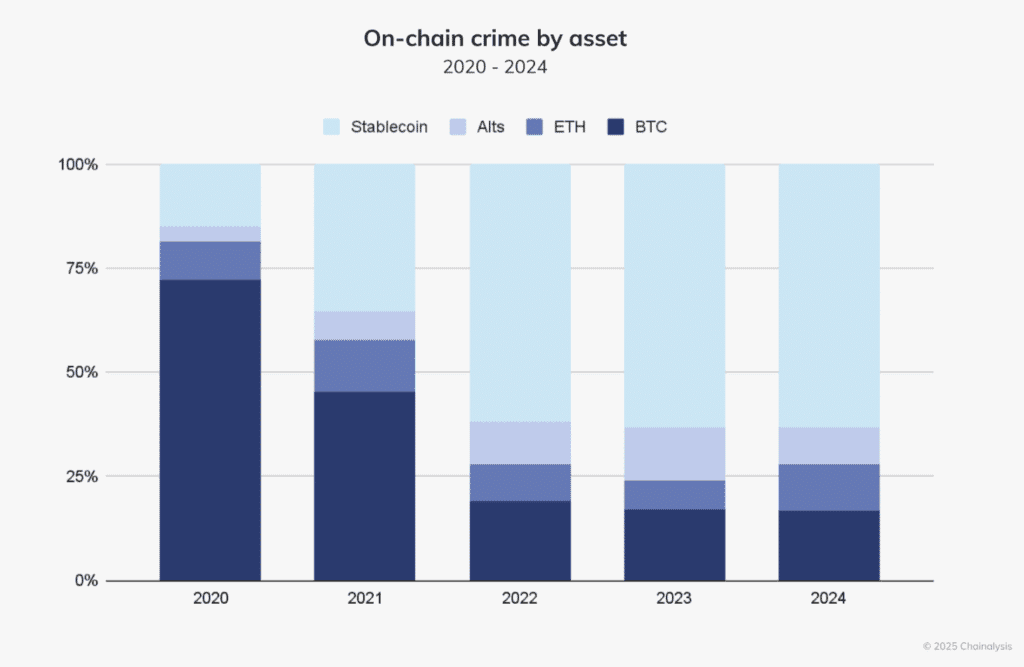 Mientras que Bitcoin era anteriormente la opción preferida por los ciberdelincuentes debido a su alta liquidez, actualmente las stablecoins dominan este escenario, representando el 63% de todas las transacciones ilícitas, tal y como se puede obvservar en este gráfico