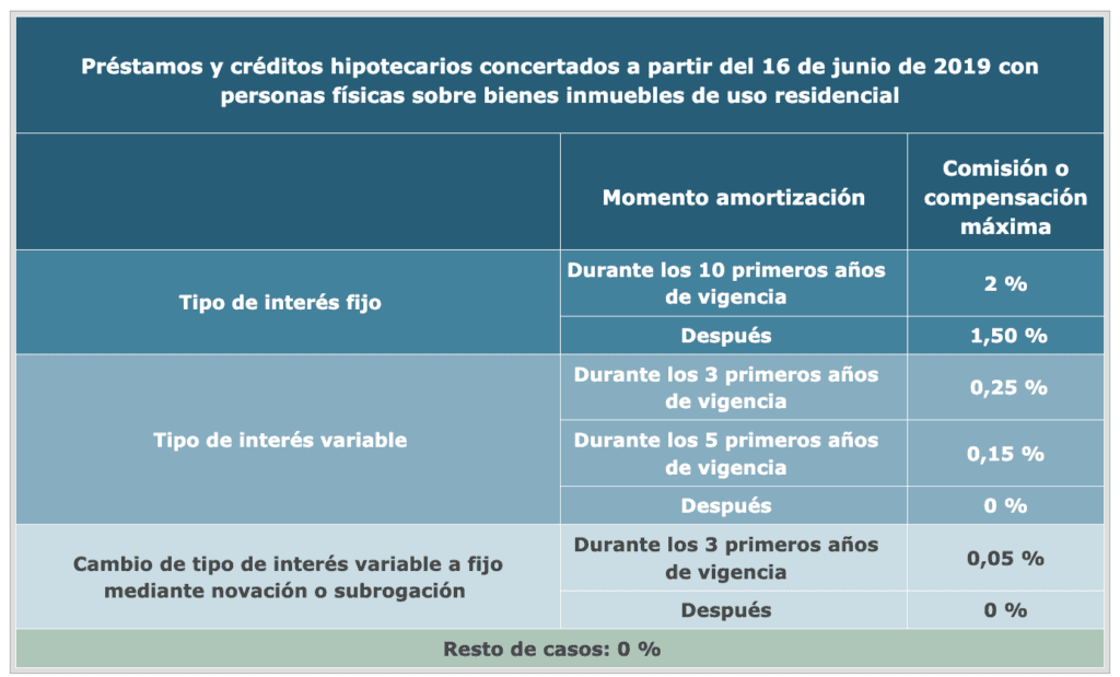 Aquí te dejamos una tabla con las comisiones por amortización anticipada extraída del Banco de España para hipotecas contratadas antes del 16 de julio del 2019.