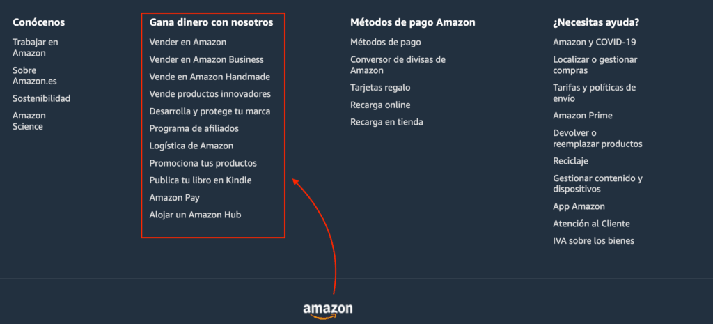 El gigante de ventas sabe que si tu haces dinero, ellos también. Tal es su ambición de negocio que incluso al pie de su página web tienen dedicada una enorme sección donde explican como puedes hacer con Amazon.