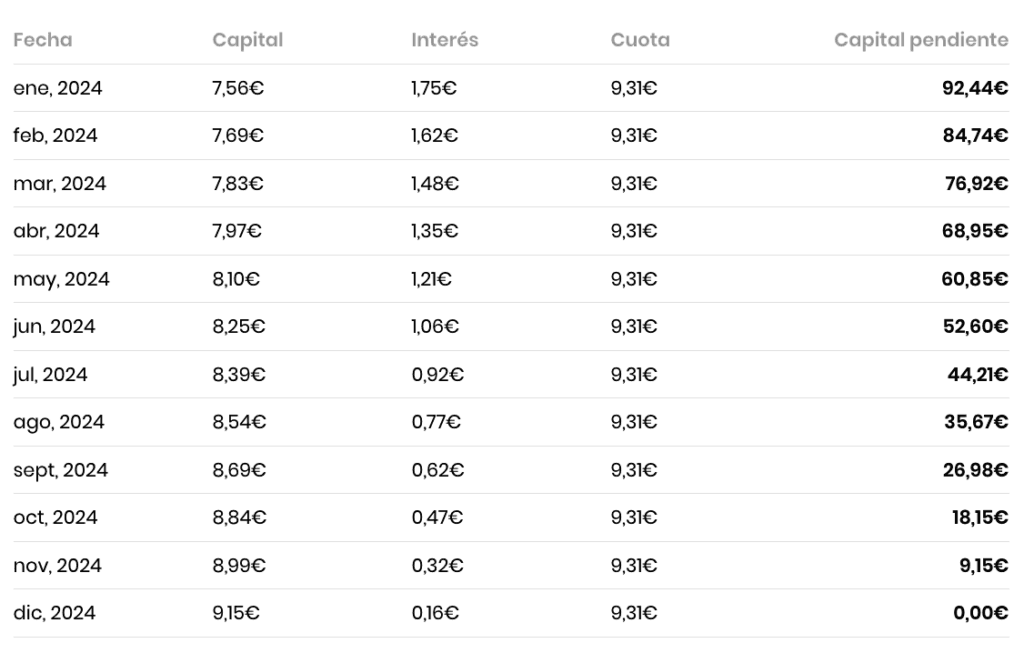 De esta manera, en los últimos meses de amortización con el sistema francés, estarás pagando principalmente el capital y una mínima parte de los intereses.