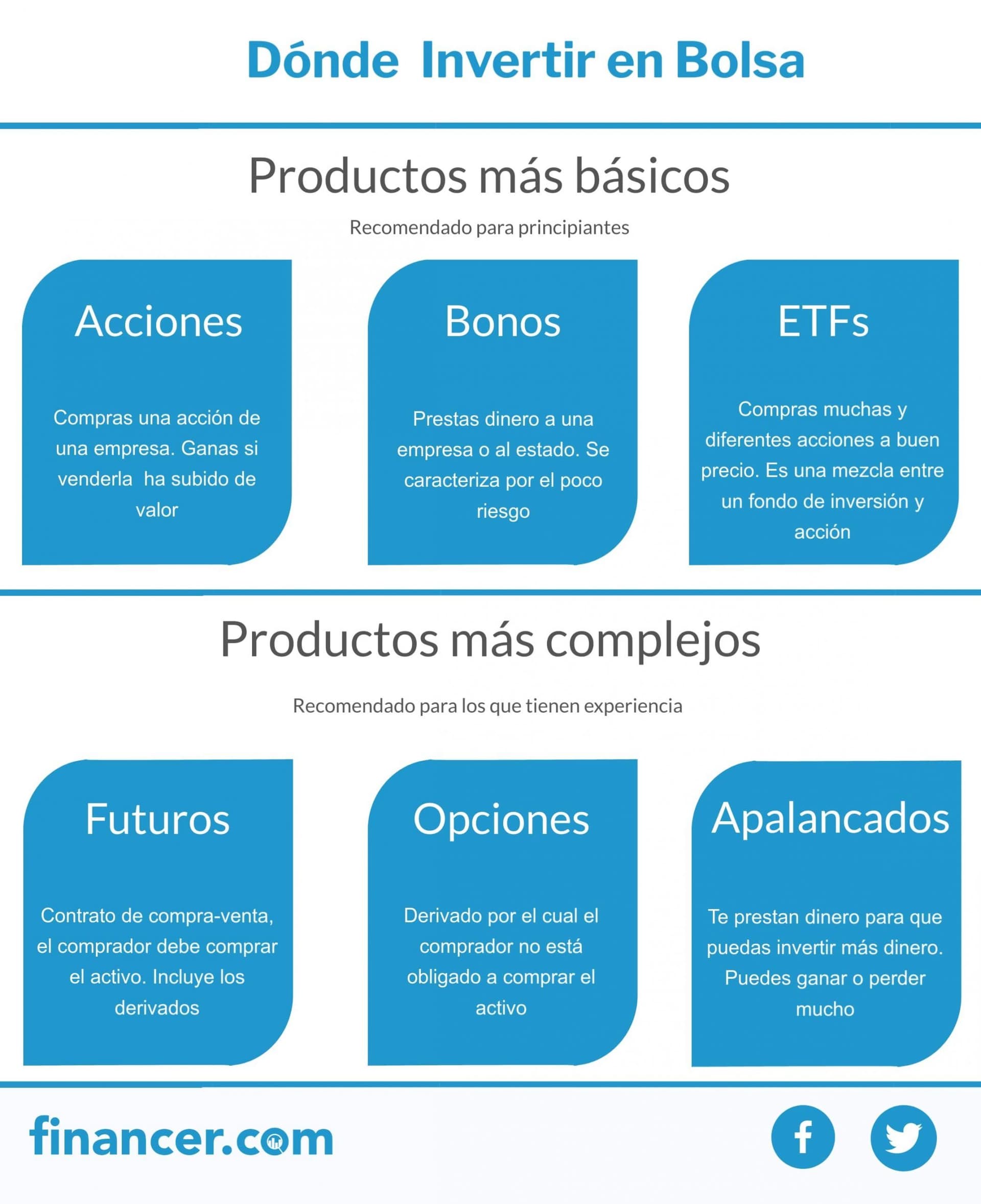 Cuando seleccionas plataformas bróker verás que te aparecen grandes bloques para invertir: acciones, opciones, futuros y ETFS.