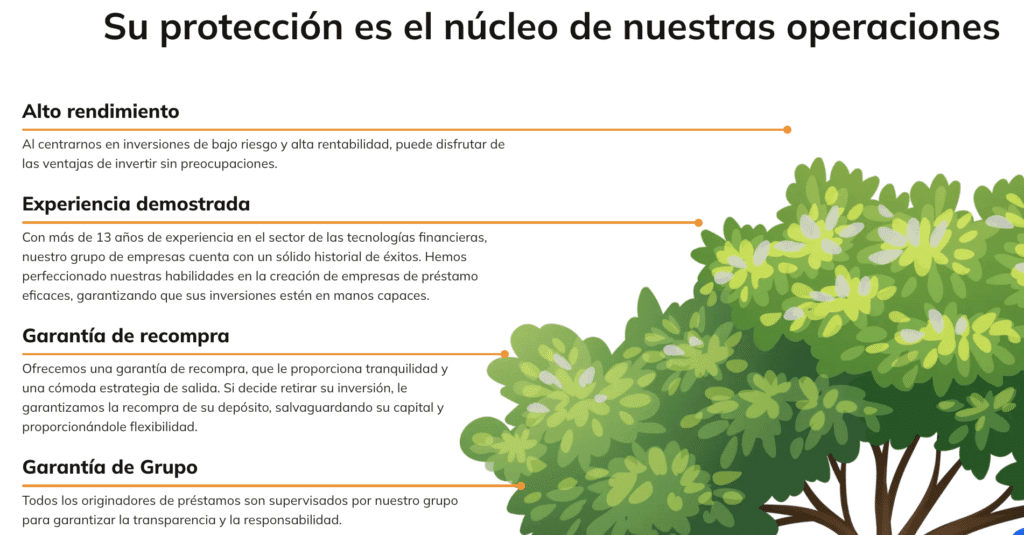 | Evaluación general | ⭐⭐⭐⭐☆ | Una plataforma innovadora para inversores que priorizan la seguridad sin sacrificar rentabilidad. |