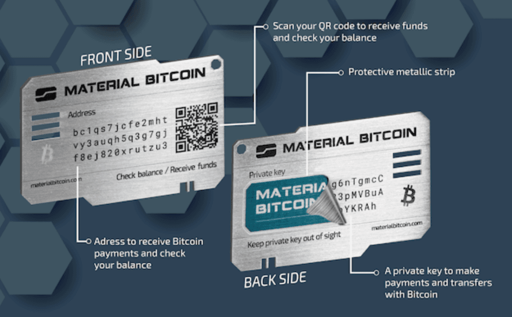 Material Bitcoin es un monedero frío (cold wallet) no electrónico, es decir, es una billetera de uso exclusivo para guardar tus criptos.