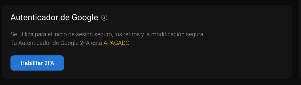 Un aspecto que debes tener en cuenta es que dispone de un factor de doble seguridad, el cual **debes activar manualmente **desde la sección de tu cuenta. En otras plataformas de inversión, la clave de seguridad es obligatoria.