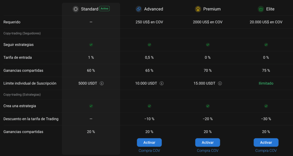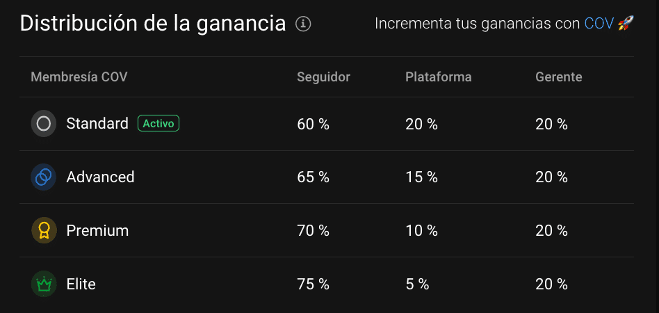 El** token COV permite obtener recompensas y beneficios en la opción de Copy-Trading. **