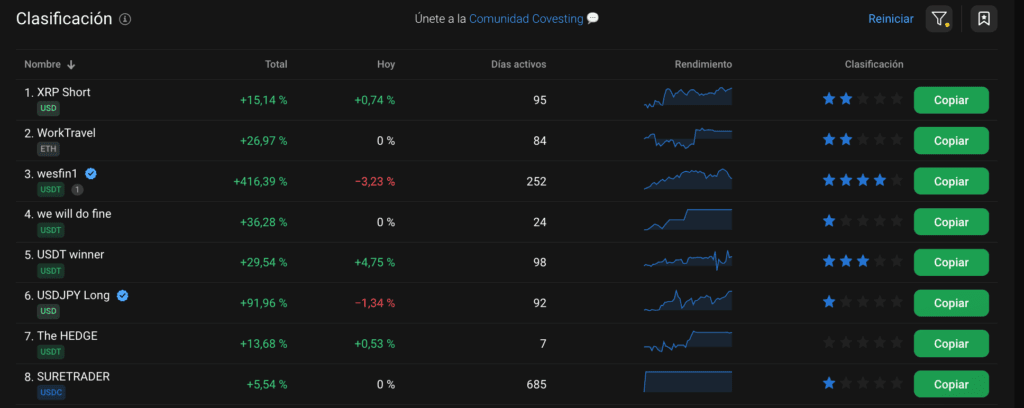 En la sección de CopyTrading, puedes copiar diversos inversores experimentados, y escoger entre aquellos que tengas más días activos, rentabilidad y la valoración por otros usuarios.