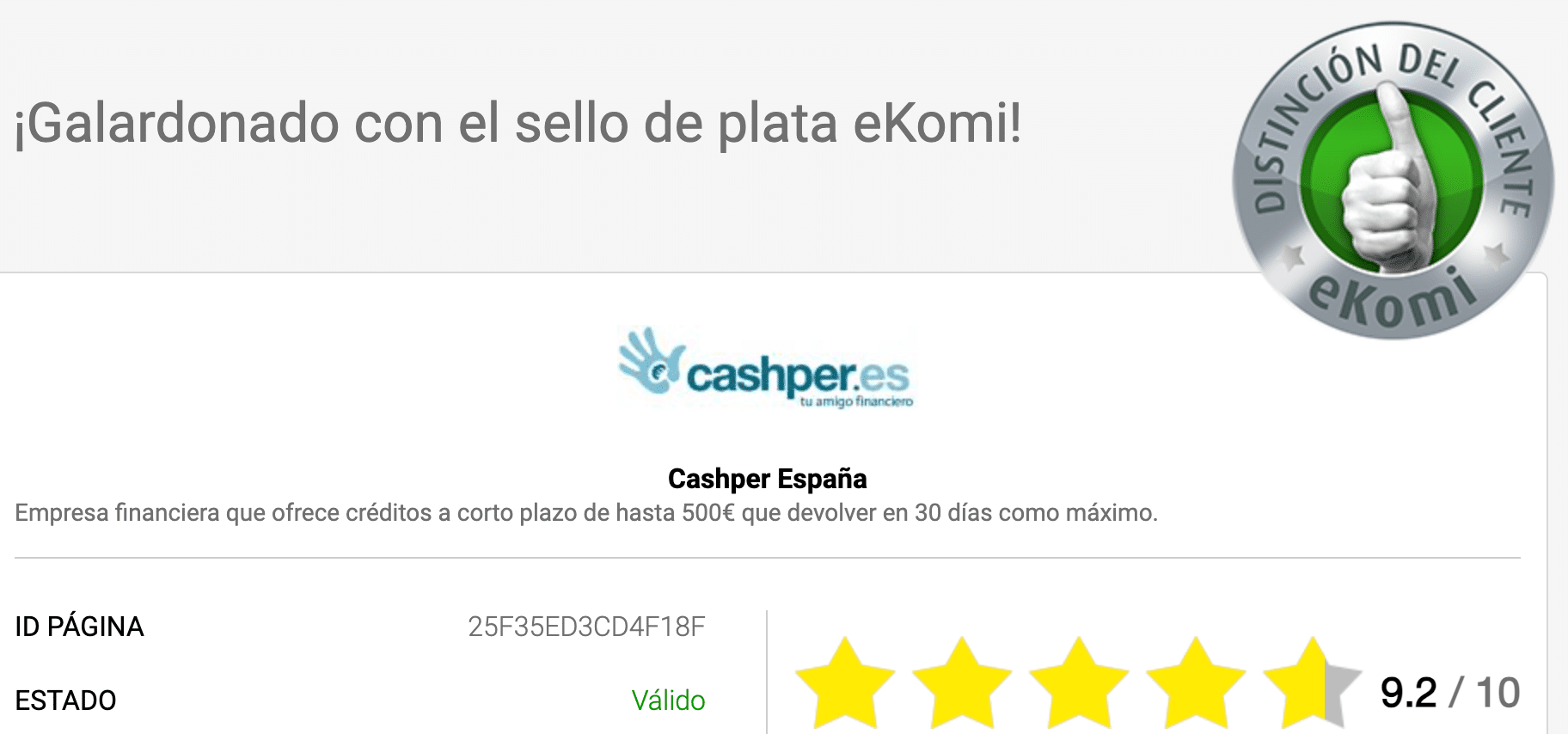 La financiera Cashper ha recibido una puntuación de 9.2 sobre 10 en Ekomi.