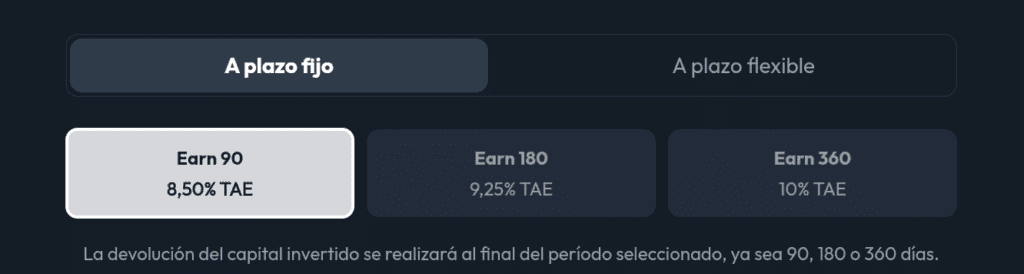 El sistema Earn está disponible en Euro, Dólar, Bitcoin y Ethereum y se pueden escoger 3 plazos: 90 días, 180 días, 360 días.