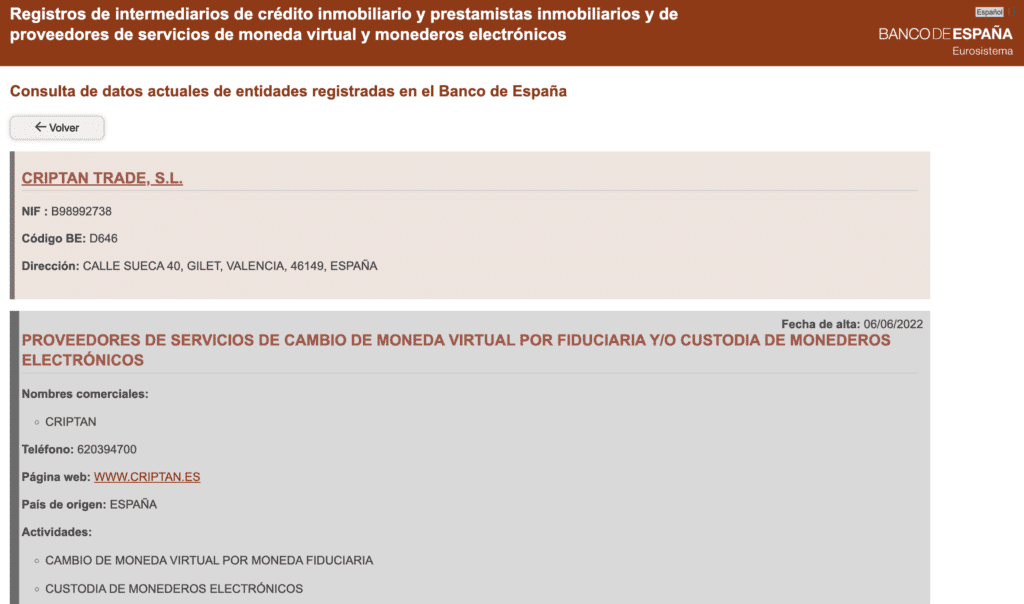 La entidad está registrada en el Banco de España bajo el número D646, lo que le autoriza a ofrecer servicios de compra y venta de criptoactivos.