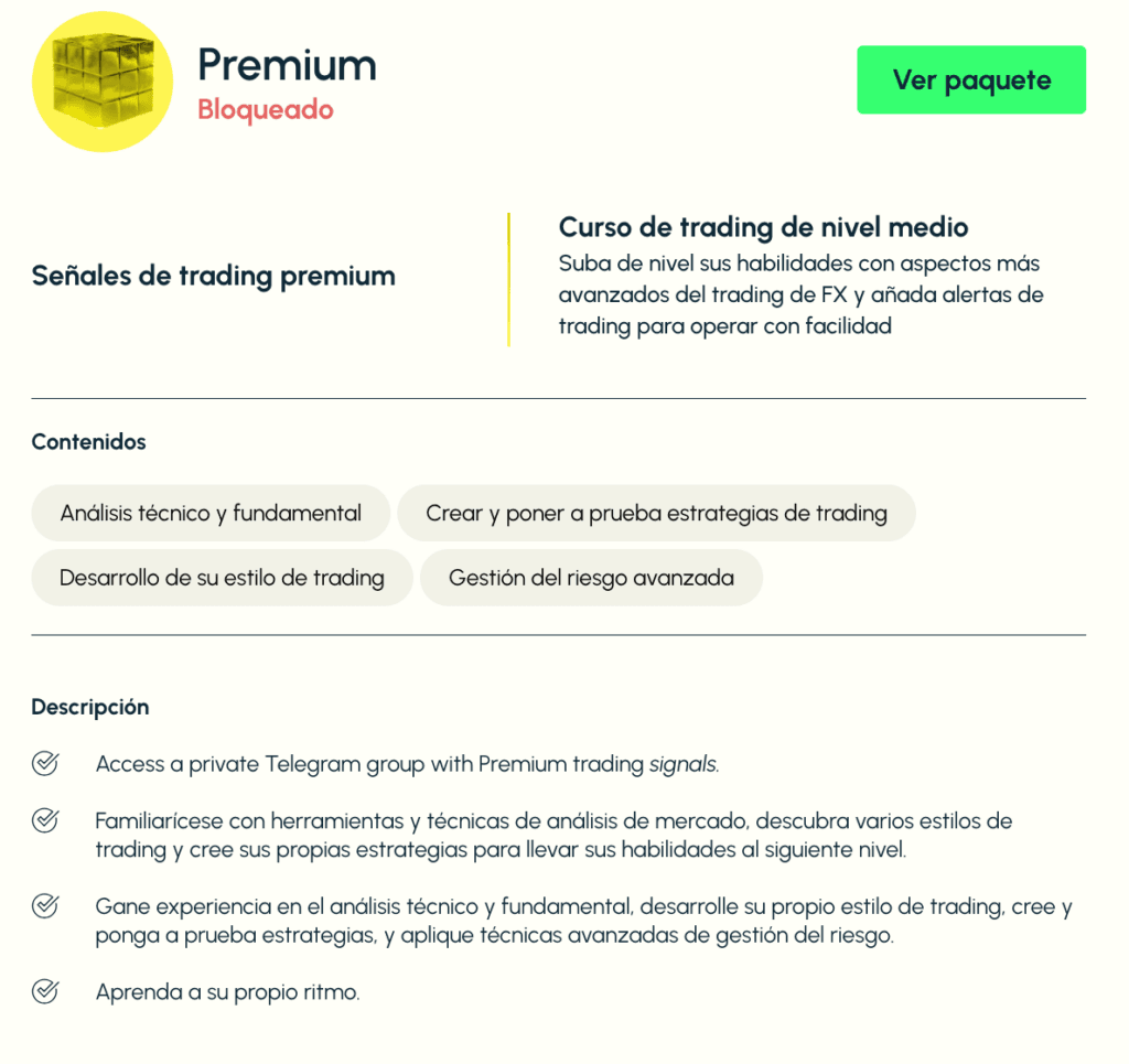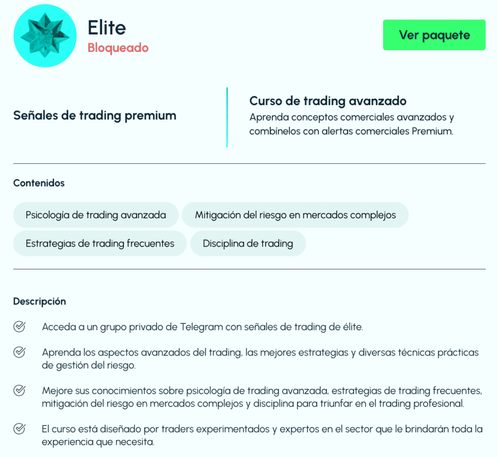 Ofrecen acceso ilimitado a los cursos y canal de Telegram para premium y elite. Sin embargo, faltan detalles sobre quién proporciona las señales de trading y hay poca información sobre las condiciones de uso.