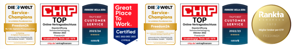 Freedom24 ha recibido varios premios, en En el 2020 fue nombrada entre las mejores empresas según Globank Banking & Finance Review y es de los mejores brókeres recomendados en Bloomberg.