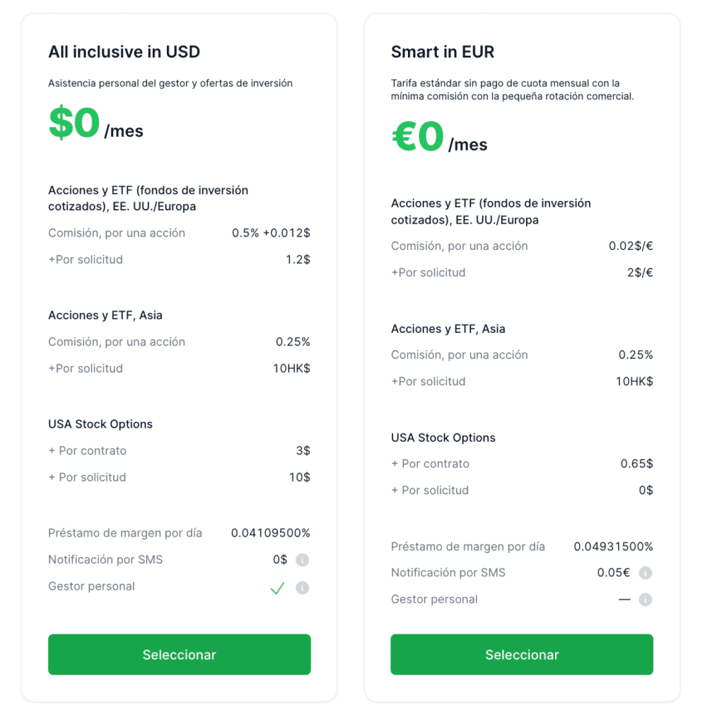 Freedom24 no impone un depósito mínimo ni una tarifa de inactividad, pero ofrece dos planes de tarifas diferentes: "All Incusive" en USD y Cuenta "Smart" en EUR.