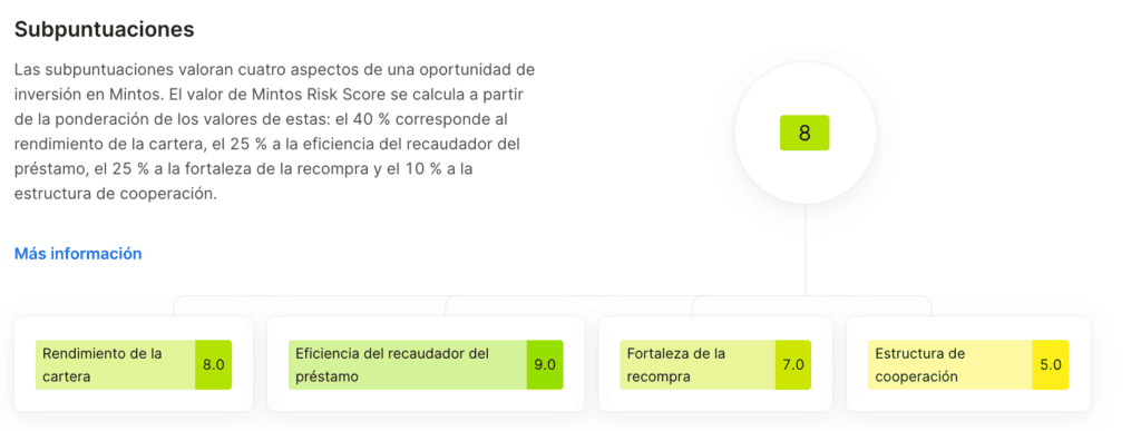 El Mintos Risk Score es una puntuación que mide el nivel o capacidad que tiene el proveedor para recomprar el préstamo en caso de impago y viene indicado por colores; verde para los de menos riesgo y rojo para los de mas riesgo.
