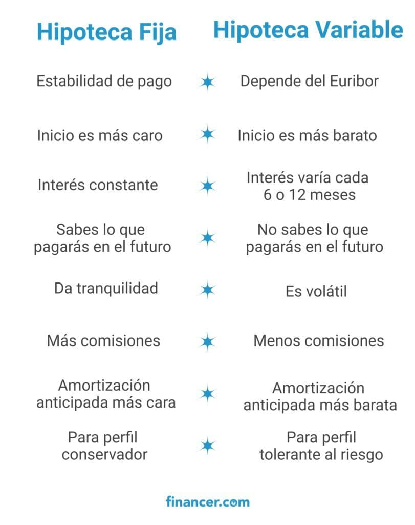 - Variable tiene un interés variable, es más barata al principio pero se puede encarecer o abaratar según las fluctuaciones del Euribor