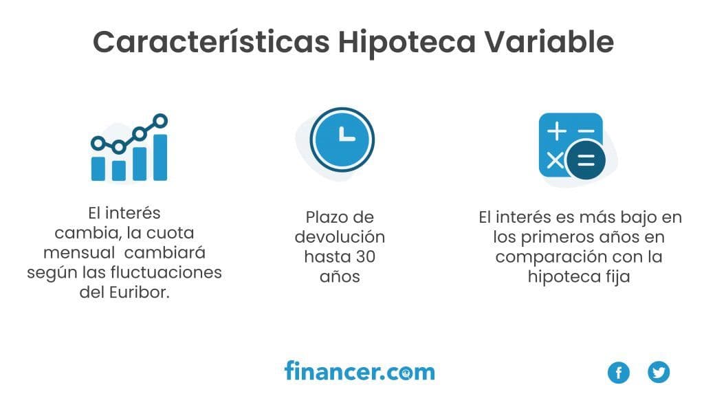 La hipoteca variable tiene la ventaja de ofrecer al principio una interés mucho más bajo, pero con el riesgo de que este pueda subir (dependerá principalmente de a cómo se sitúe el Euribor). Este tipo de hipoteca es la más contratada en España.La hipoteca mixta ofrece un interés algo más elevado durante varios años (generalmente entre 10 y 15 años) y posteriormente pudiendo escoger un interés a tipo variable. Ofrece la ventaja de poder tener la seguridad de pagar siempre la misma cuota durante los primeros años.